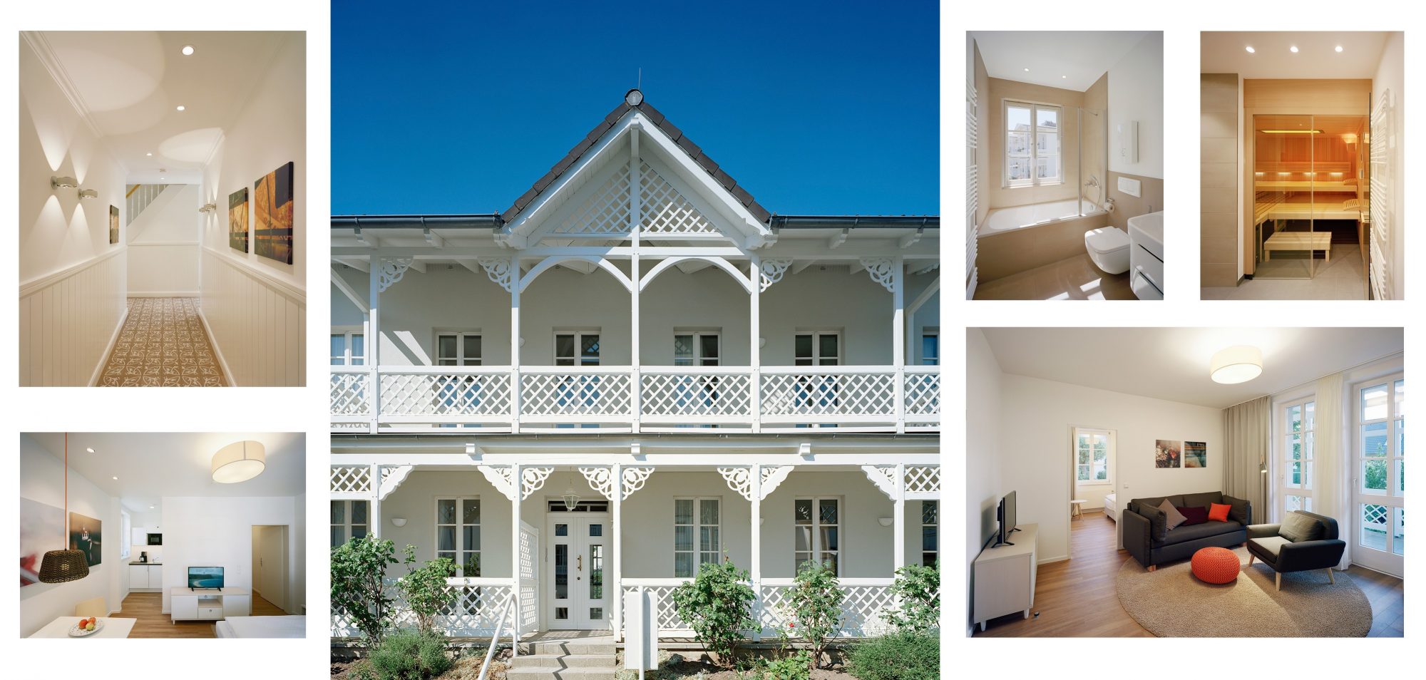 3 Min. Fußweg zu Strand/Strandpromenade, Nord- und Südstrand, originalgetreu rekonstruiertes, denkmalgeschütztes Rügenstilhaus (klassischer Bäderstil), 8 komfortable, individuell, geschmackvoll und großzügig gestaltete moderne Appartement- und Maisonettewohnungen für 2 – 8 P. (33 – 90 qm). Moderne Küche mit 4-Ceran-Platten-Herd, Kühlschrank mit ***Gefrierfach, Spülmaschine, Mikrowelle u.v.m. Separater Essbereich, Balkon, TV, Telefon, abgeschlossene Parkplätze am Haus, Garten, WLAN, hauseigene Sauna mit Gartenzugang zum englischen Teehaus. Alle Geschäfte, Restaurants und Bäckereien in unmittelbarer Nähe. Individuelle Anreise, ganzjährig geöffnet (Nach-, Zwischen-, Hauptsaisonpreise).
